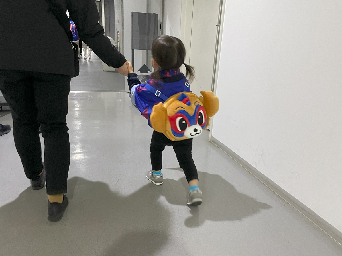 小さいお子さんには、クラブマスコットである東京ドロンパのリュックがプレゼント!観戦グッズとしてはドンピシャで羽生氏も「かわいい!」と写真を撮っていた。