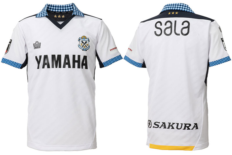2024新アウェイユニフォームは引き続きホワイトを基調に、遠州地域ゆかりの遠州縞をデザイン。