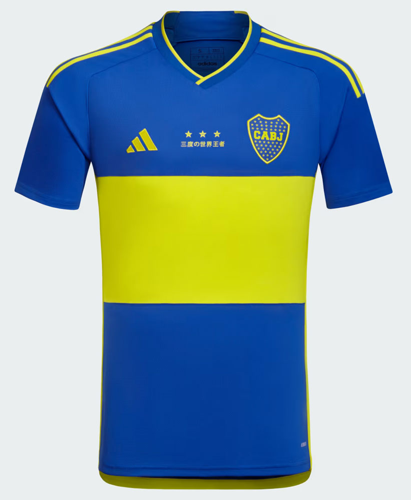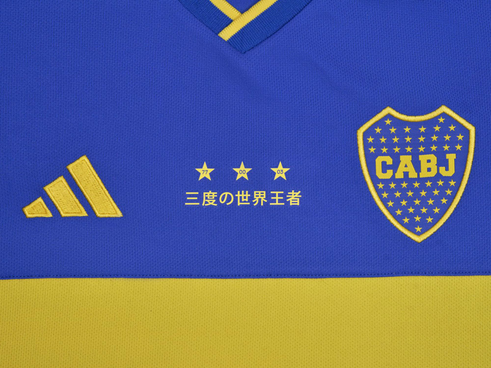 クラブの歴史を讃えるスペシャルエディション・ユニフォーム。正確なアイテム名はスペイン語で“Camiseta Aniversario Boca Juniors 23”で、ユニフォーム胸部には日本語で「三度の世界王者」とレタリングする。