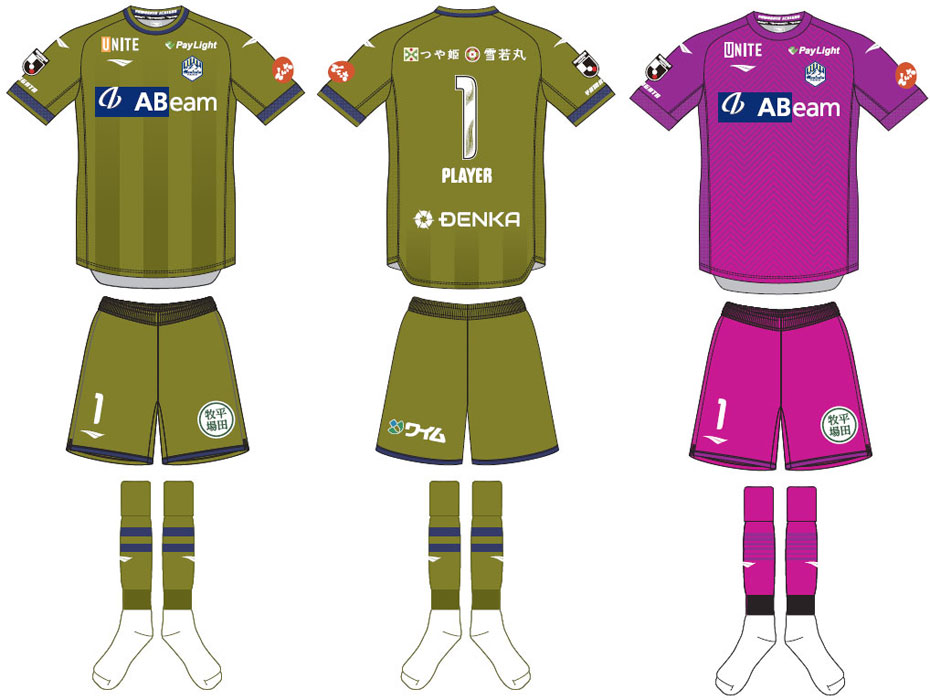 新GKユニフォームも引き続き2色展開で、1stにグリーン、2ndにピンク系を採用。1stの色はモスグリーン的で、2ndは山形の特産品である葡萄を思わせる。