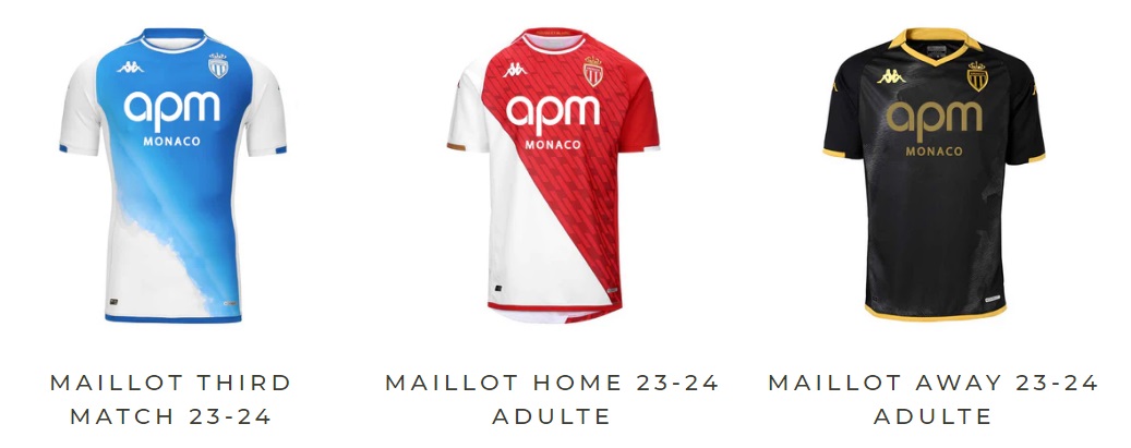 今季のKappaは、赤い部分に昇華したグラフィックを用いることでそのデザインをさらなる高みへと導いた。黒を基調としたアウェイは金で縁どられている。そして、サードは、地中海に面するモナコ公国を象徴するためにホームの赤部分を青にした。