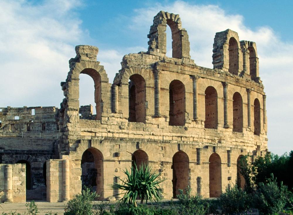 前面のグラフィックは、1979年に世界遺産に登録された円形闘技場を描いたもの。チュニジア南東部の街エル・ジェムに存在するこの闘技場は3世紀に建てられ、収容人員3万5千人を誇る巨大な建造物だ。この闘技場で死刑囚vs死刑囚、猛獣vs人間など生死をかけた戦いが行われたという。