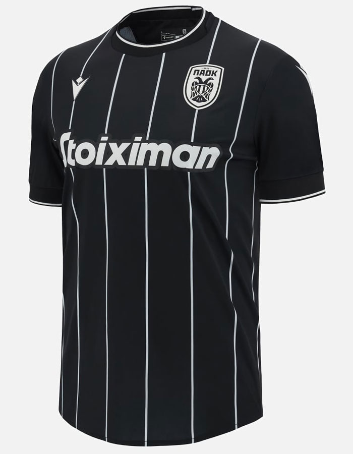 契約9シーズン目のMacronとは非常に“相性”が良く、近年は好デザインを連発する。今季のアウェイもその一つで、PAOKお馴染みのブラックを基調に極細ストライプが格好よい。UEFAヨーロッパ・カンファレンスリーグでは別スポンサーを付けることもある。