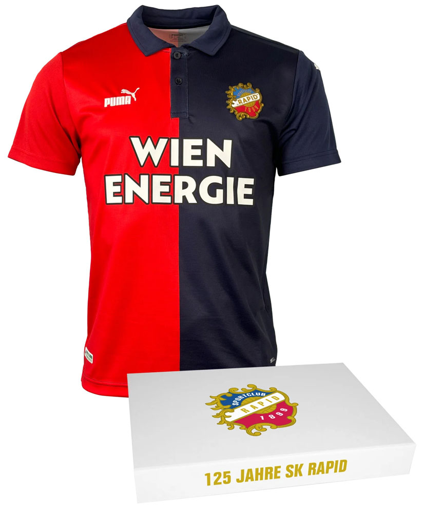 1899年1月8日に創設されたラピドの125周年記念ユニフォームは、アウェイユニフォームに使われることも多いレッドとネイビーの半々デザイン。現在ではグリーンとホワイトがクラブカラーだが、1899年のクラブ創設時から数年間は今回の2色が使われていた。
