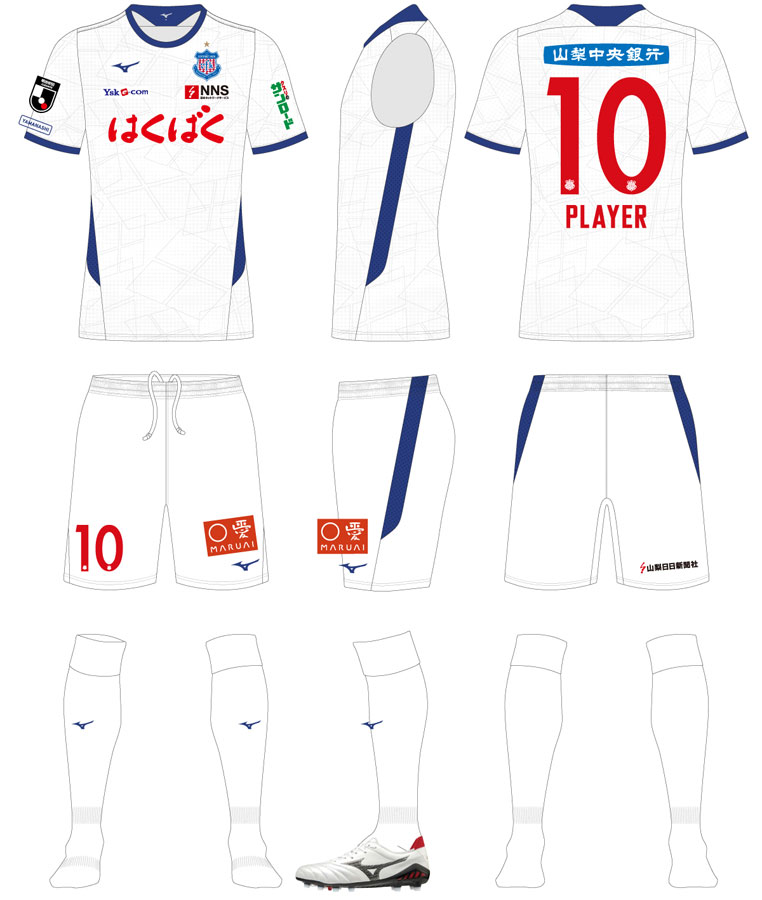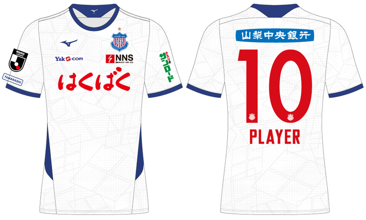 現時点での各部スポンサーは、胸に「はくばく」、鎖骨左に「NNS(日本ネットワークサービス)」、鎖骨右に「YSK e-com」、背中上に「山梨中央銀行」、左袖に「クスリのサンロード」、パンツ前面に「マルアイ」、パンツ後面に「山梨日日新聞社」。