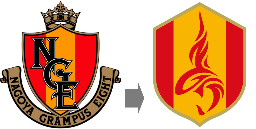 エンブレムのデザイン変更は昨年大きな話題となった。バーバリアンレッド(グランパスレッド)を継承し、中央にはこれまでの「NGE」と「鯱」を組み合せたロゴマークを配する。上昇するような形状は「世界の頂点を目指す」という意思を込めたものだ。