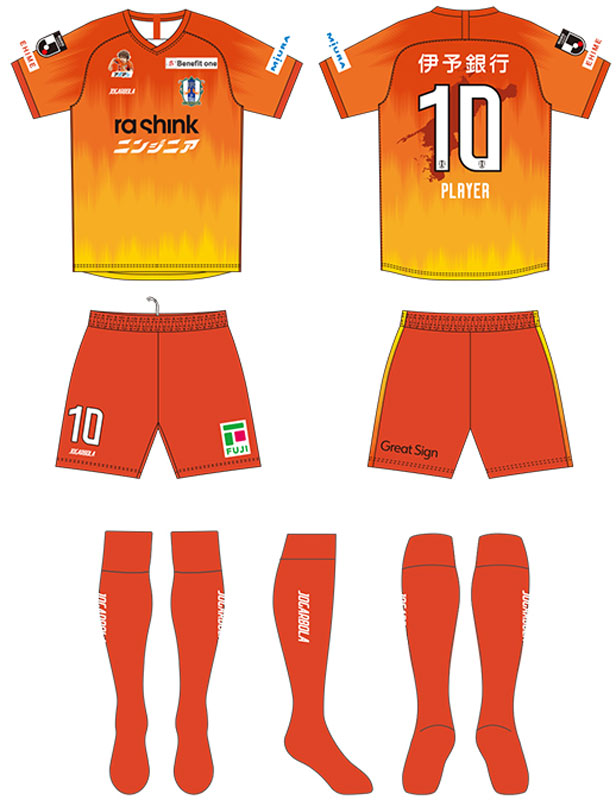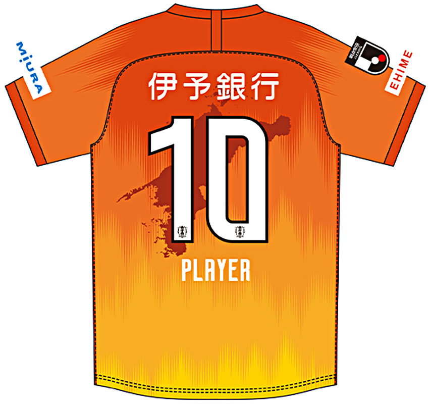 背面には引き続き愛媛県の地形をデザイン。愛媛県民への感謝の想い、そしてホームタウンである愛媛県全域20市町の希望と期待を背負い戦う情熱を表す。