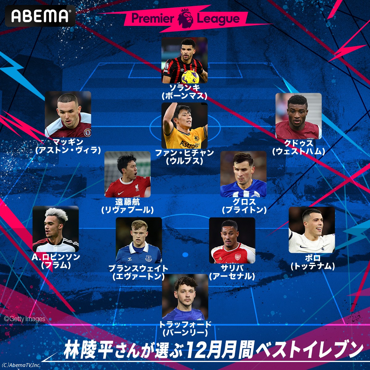2023-24シーズンのイングランド・プレミアリーグを放送している『ABEMA』は19日、解説を務めている林陵平が選んだ12月のベストイレブンを発表した。