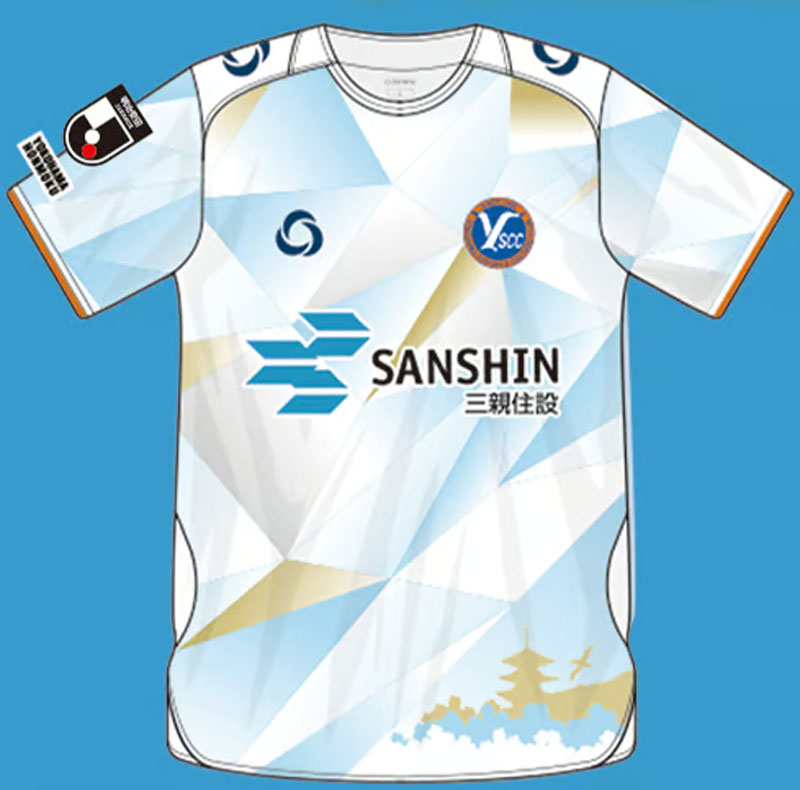 新アウェイユニフォームも、ホームと同じくホームタウンの海が魅せる様々な模様に「三溪園」を重ねるデザイン。こちらはゴールドの差し色が印象的だ。