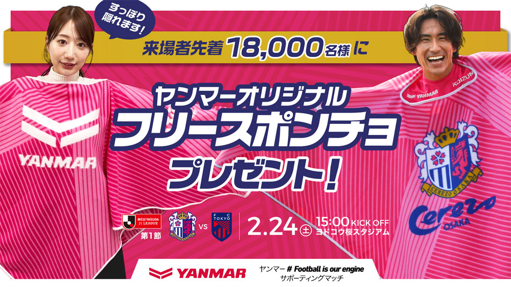 このホーム開幕戦はクラブトップパートナーのヤンマーホールディングス(株)による『ヤンマー #Football is our engine サポーティングマッチ』として実施し、来場者先着18,000名に「ヤンマーオリジナルフリースポンチョ」のプレゼントが決定した。