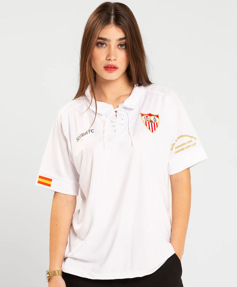 記念すべき決勝戦モデルは、クラシックな胸元の編み上げが当時好評を博したデザイン。オリジナルのユニフォームは右胸の「Sevilla FC」部分にサプライヤーJomaのロゴが付く。