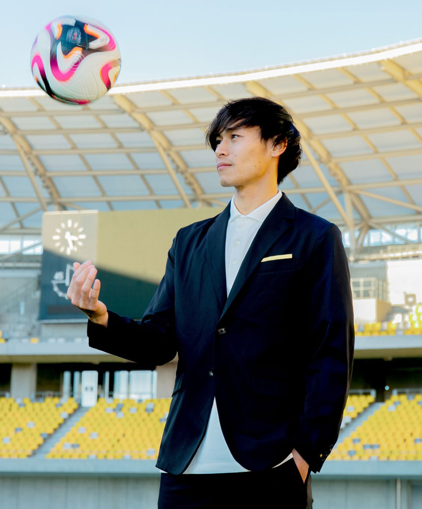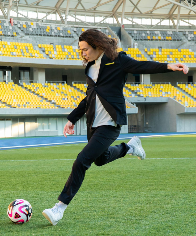 アクセントカラーに栃木SCのチームカラーであるイエローを使用。着用した際に身体にフィットするような立体感のあるシルエットに仕上げ、ビジネスシーンでも使える一着となっている。