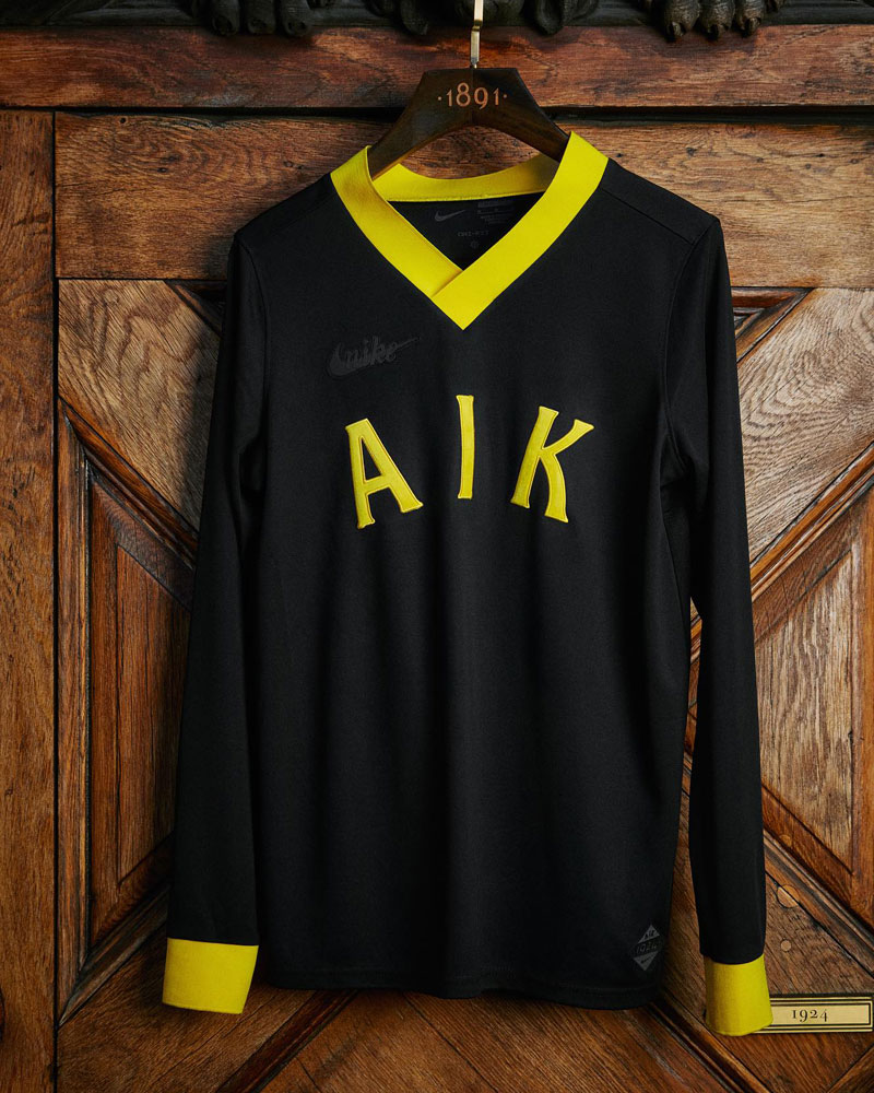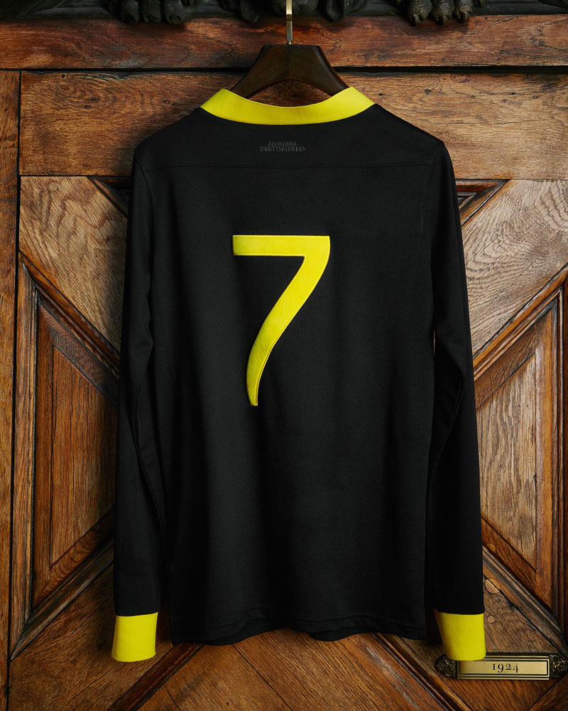 今回のユニフォームはブラックを基調としたシンプルなもので、イエローで太めに縁取られた大きめのVネックが印象的。そして胸には“AIK”をレタリング。これらは全て1924年当時のキットデザインをモチーフとしたものだ。