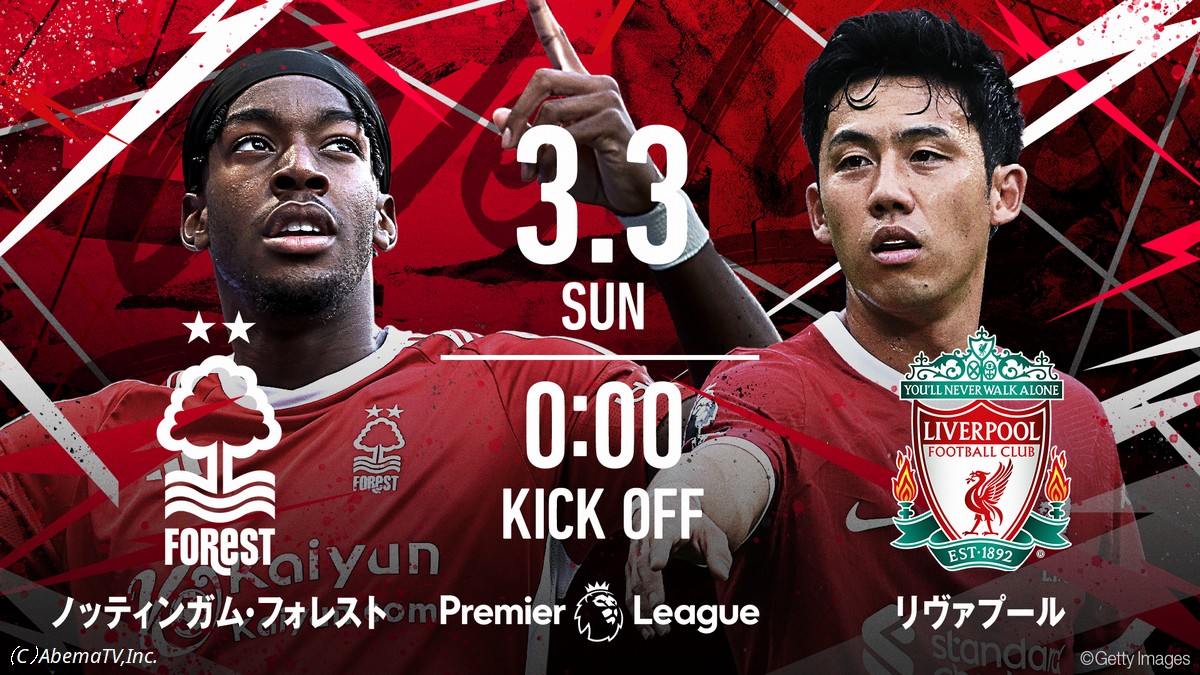 3月の注目試合は、カラバオ杯優勝に大きく貢献した遠藤航選手が所属するリヴァプールが、4冠をかけて戦う「ノッティンガム・フォレストvsリヴァプール」となります。本試合は、「ABEMA」にて3月3日(日)午前0時より無料生中継。解説には元東京大学運動会ア式蹴球部監督で東京ヴェルディなどでも活躍した元Jリーガーの林陵平さんが務めます。