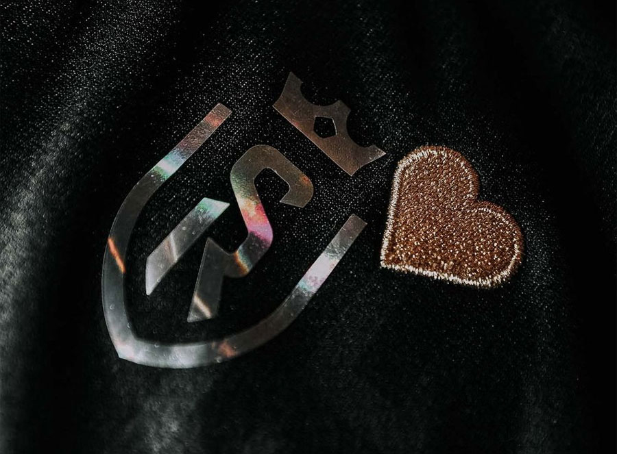エンブレムやスポンサーなど各部のロゴマークは、光の当たり方によって色が変化する素材(ダイクロイックもしくはルミニストなど)を使用し特別感を演出。エンブレム横のハートマークも同様に色味が変化する素材の可能性もある。