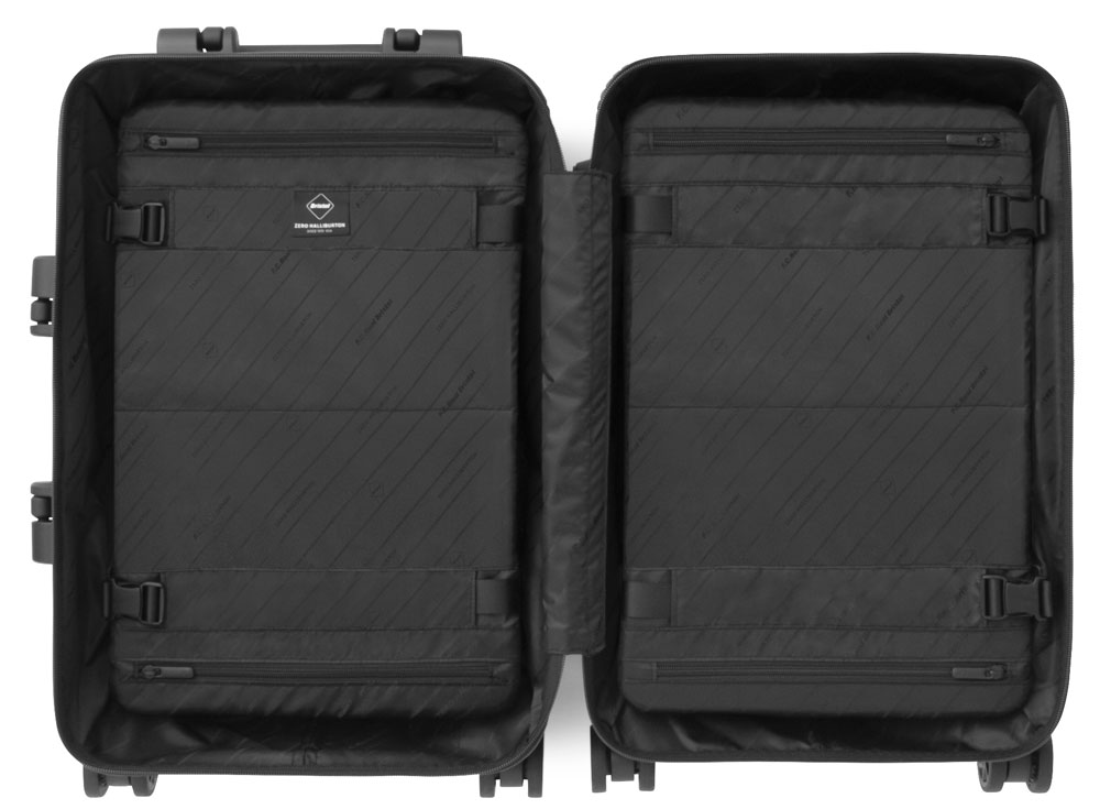 内側にはゼロ・ハリバートンとF.C.Real Bristolのダブルネームタグ付き。内装の生地にはジャカード織を使用する。レザー製ロゴ入りラゲージラグ(ネームタグ)も付属。