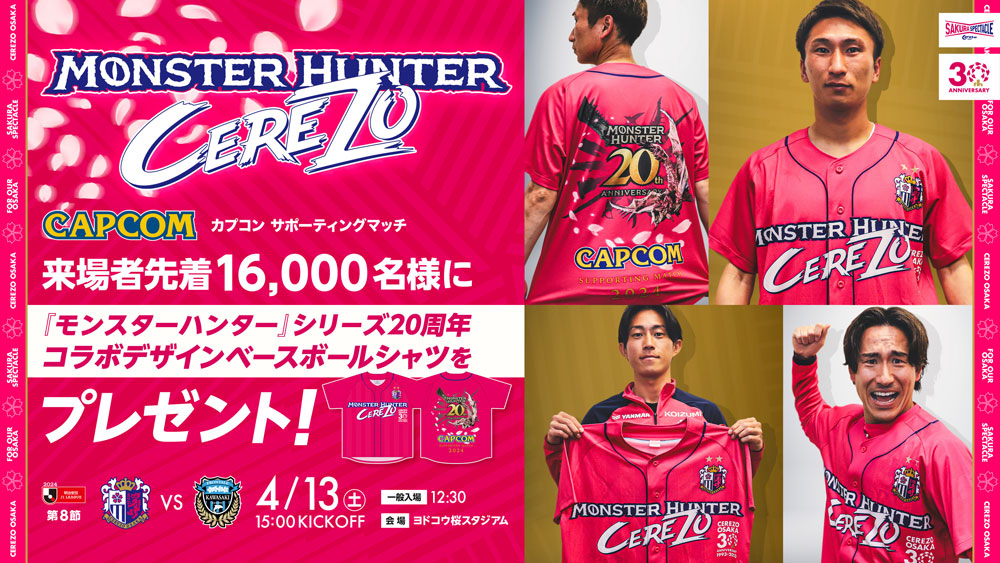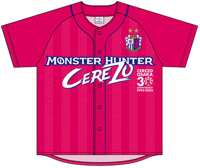 ベースボールシャツはC大阪のクラブカラーのピンクを基調とし、チェストに「MONSTER HUNTER」と「CEREZO(セレッソ)」のダブルネームを、左胸にクラブ30周年記念ロゴをそれぞれデザインする。