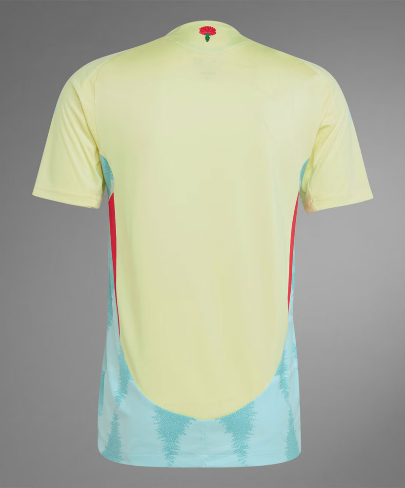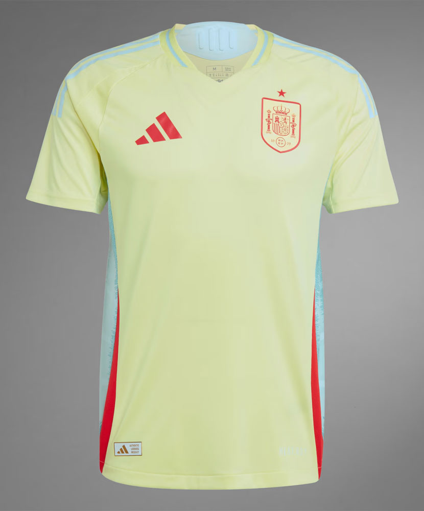 新アウェイユニフォームは衝撃カラーが登場した。この基調色を見た印象そのままに表現するなら、クリームイエローといったところだろうか。そこにレッドとスカイブルーを組み合せるという、スペイン代表史上初の恐れ知らずで大胆なキットカラーが完成した。