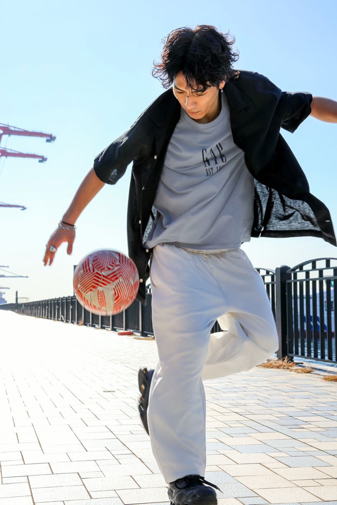 フリースタイルフットボールの世界でその名を知らぬ者はいないIbukiさん。今回はブラックのリネンシャツとスウェットパンツを合わせて、フットボーラーらしく動きやすさを重視したスタイルを披露した。