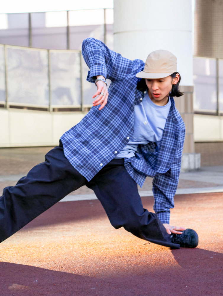 天才ダンサーの異名を持つTHE D SoraKiさん(ストリートダンサー/モデル)は、チェックのコットンリネンシャツをカーキパンツと合わせてストリート風スタイルに。