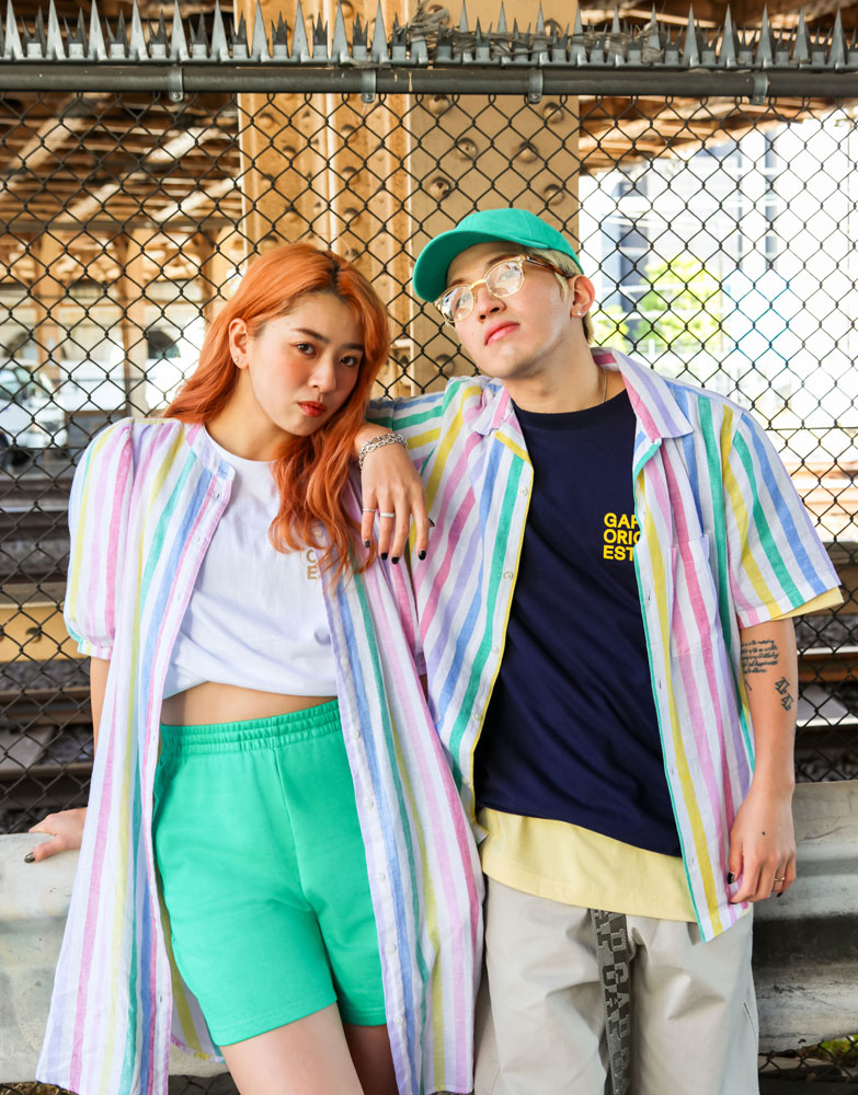 夫婦で登場した歌手のyuzunaさん(元E-girls)とKAITAさん(コレオグラファー)は、春を感じさせるストライプ柄のリネンシャツをお揃いで着用。