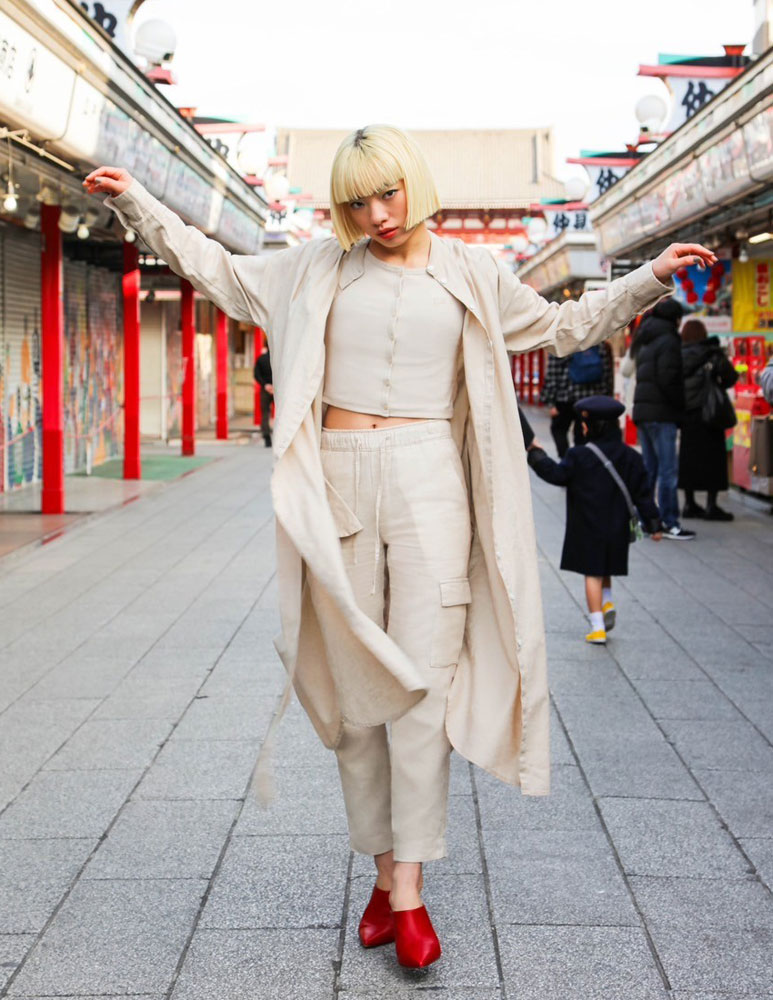 数々のミュージックビデオに出演し音楽ファンの間でも有名なアオイヤマダさん(ダンサー/俳優)は、リネンドレスを羽織ったベージュトーンのスタイルで自分らしさを表現。