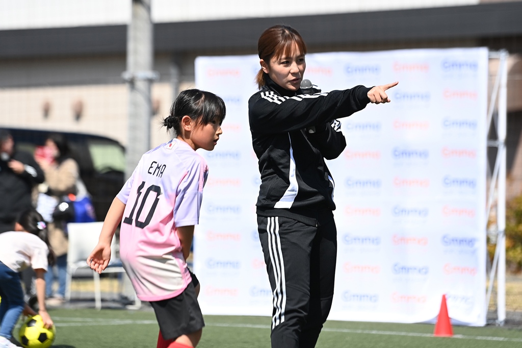 トークセッション後に行われたサッカー教室では、現役時代さながらの華麗なドリブルを披露。「自分が楽しいと思えることを見つけてみてください!サッカーでも卓球でも、絵を描くことでも何でもいいので、熱中してできるものが見つかれば、自然と努力できると思います。体を動かして疲れたら、エマのマットレスで(笑)よく寝て休んでください!」と語り、教室を締めくくっている。