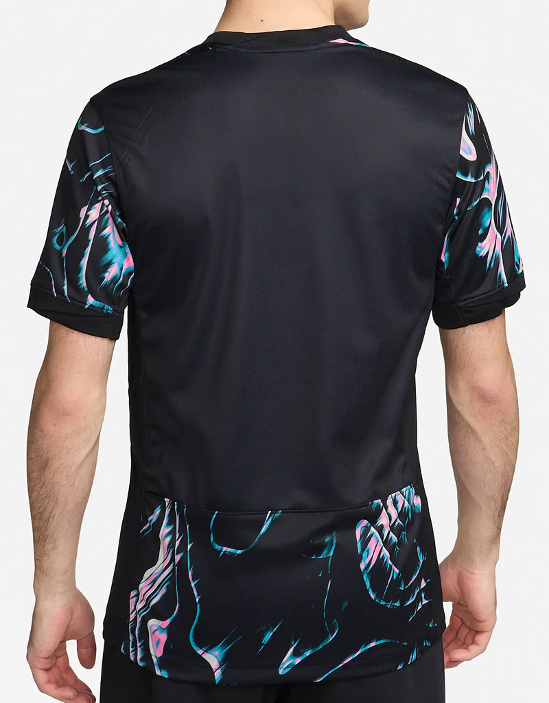 新アウェイユニフォームはブラックを基調とし、何とも形容しがたい鮮やかな模様をデザインに採用。カラフルな色使いが話題を呼んだ2022アウェイモデルとは大きく異なるが、こちらも注目を浴びそうなデザインだ。