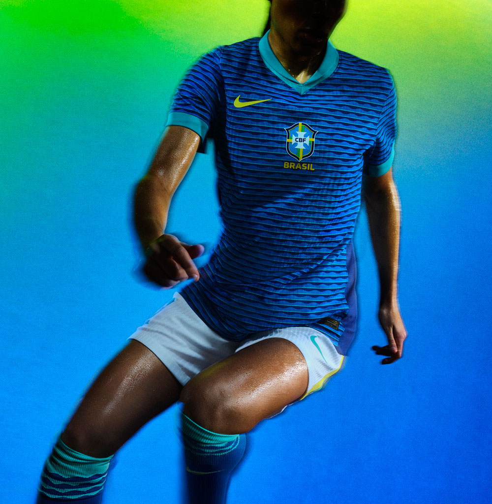 このデザインは、ブラジルの自然や伝統的な織物柄に触発されているとのこと。ブルーは国旗やエンブレムの色でもあるが、今回は海のイメージだろうか。伝統柄を用いたウェーブパターンが波を想起させる。真夏のビーチに似に合いそうなデザインだ。