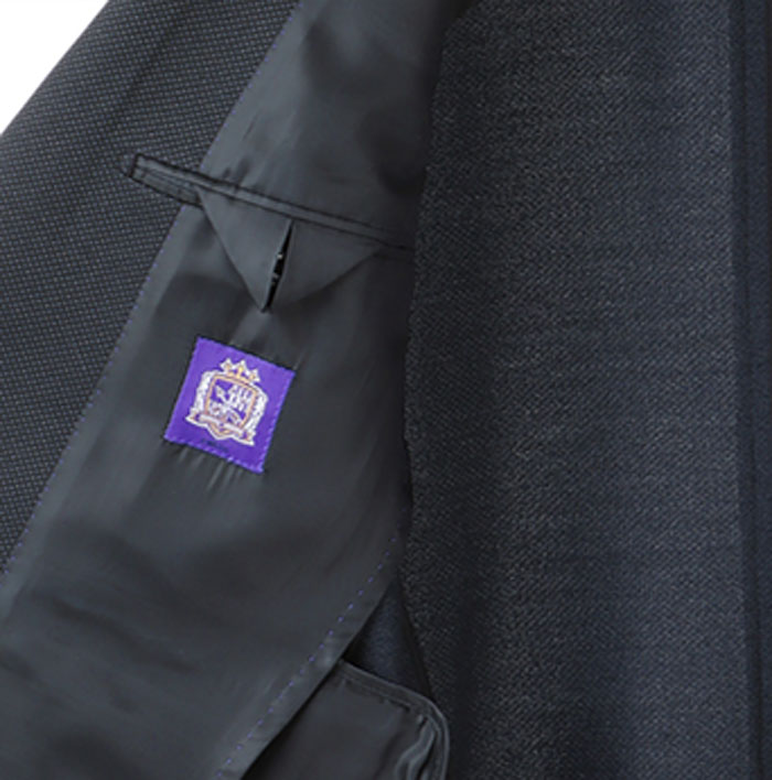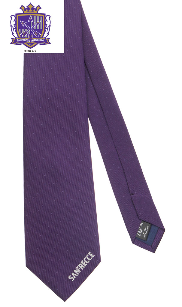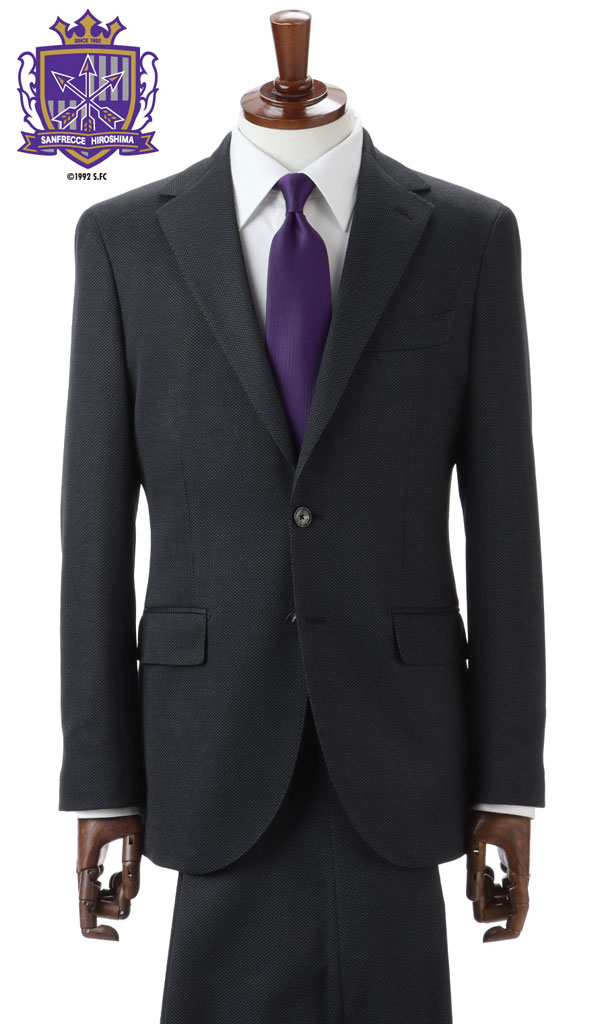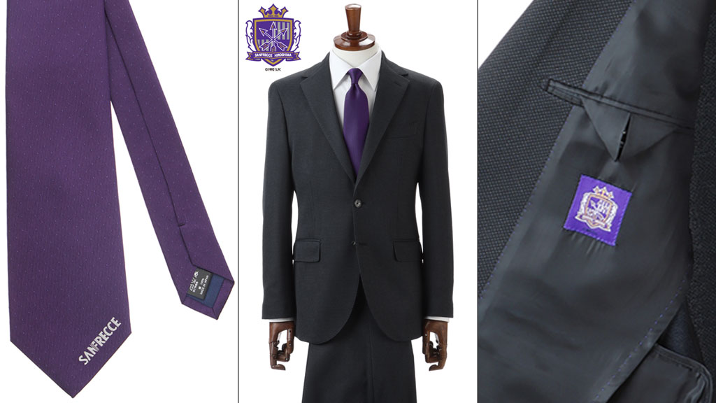 上着の内側にクラブエンブレムを配置し、見返しのパイピングにはクラブカラーを施した特別仕様に。また、ネクタイの大剣(正面の剣先)の左端には「SANFRECCE」のロゴを刺繍する。