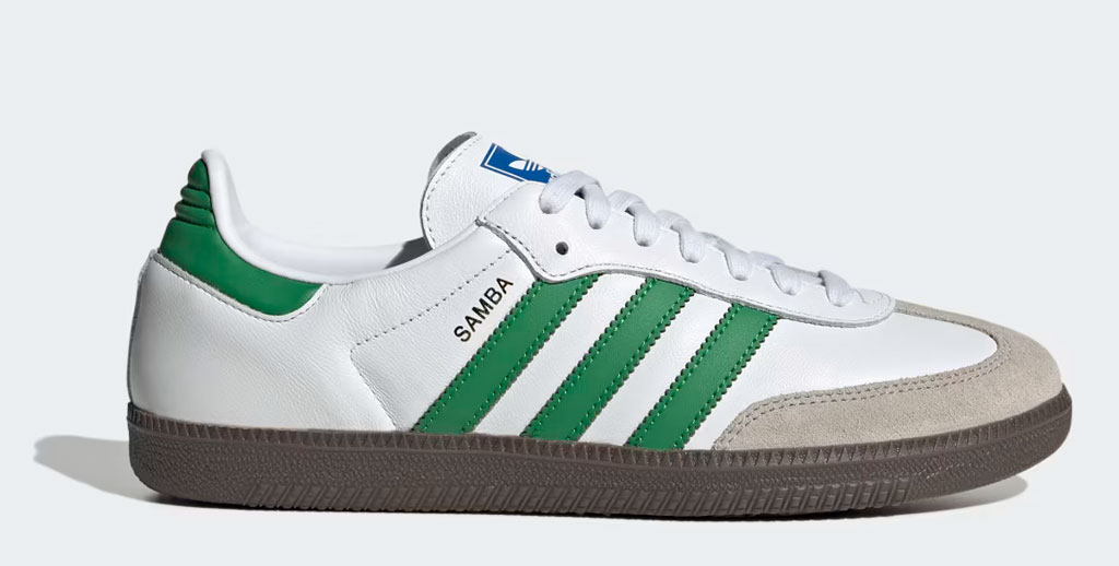 今回のバイエルンのアイテムに合わせているシューズは、adidas Originalsの人気スニーカー「SAMBA(サンバ)」。ホワイトを基調に、グリーンのスリーストライプスとのコントラストが美しい。