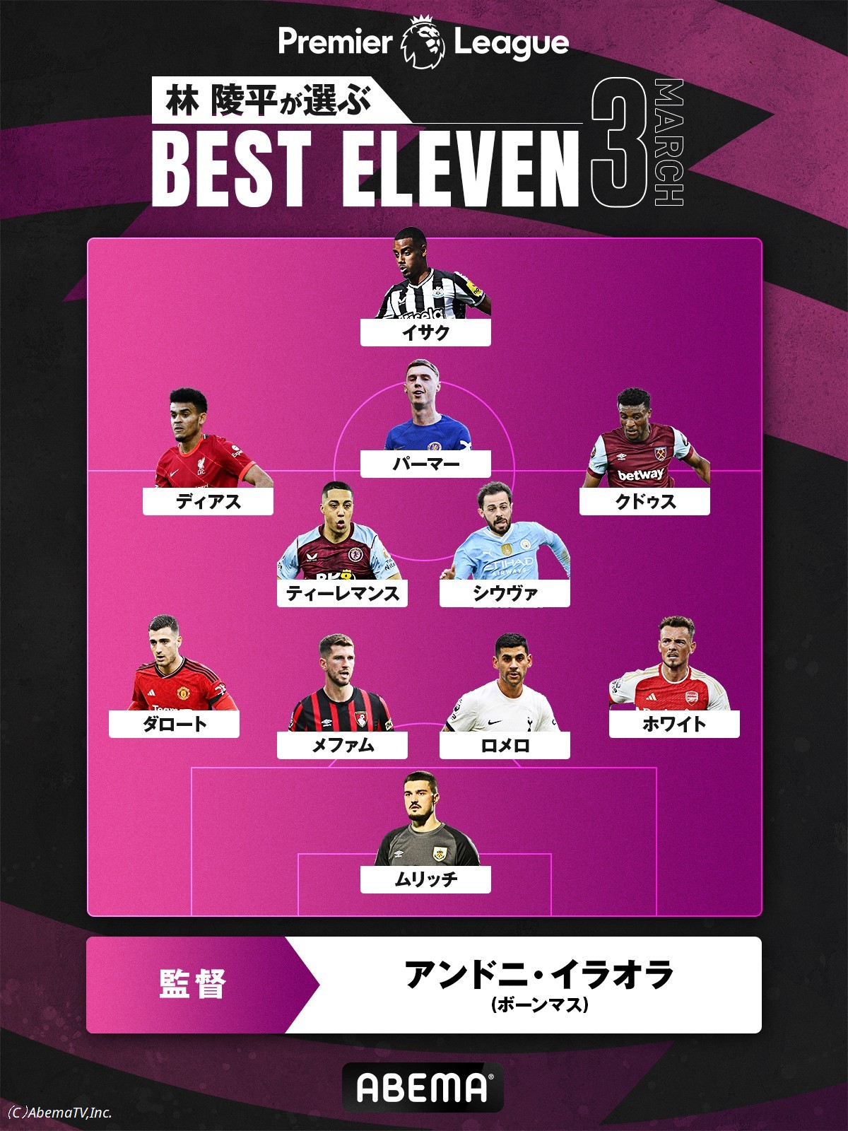 2023-24シーズンのイングランド・プレミアリーグを放送しているABEMAは、解説者の林陵平が選ぶ3月のベストイレブンを発表した。