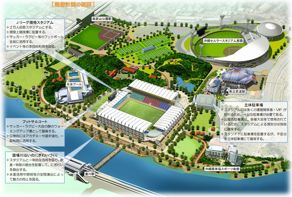 沖縄県には、FC琉球や沖縄SVなどJ1への昇格を目指すチームが存在。これらのチームに活躍の場を提供し、相手チームのファンが来沖するアウェイツーリズムを活用した観光の推進を図るとともに、“観るスポーツ”を通して地域活性化と青少年の人材育成に寄与するとの観点から、Jリーグ規格サッカースタジアムの整備が必要であるとの認識のもと、2017年8月に「Jリーグ規格スタジアム整備基本計画」が策定された(※新スタジアムのイメージはこの基本計画に掲載されている)。