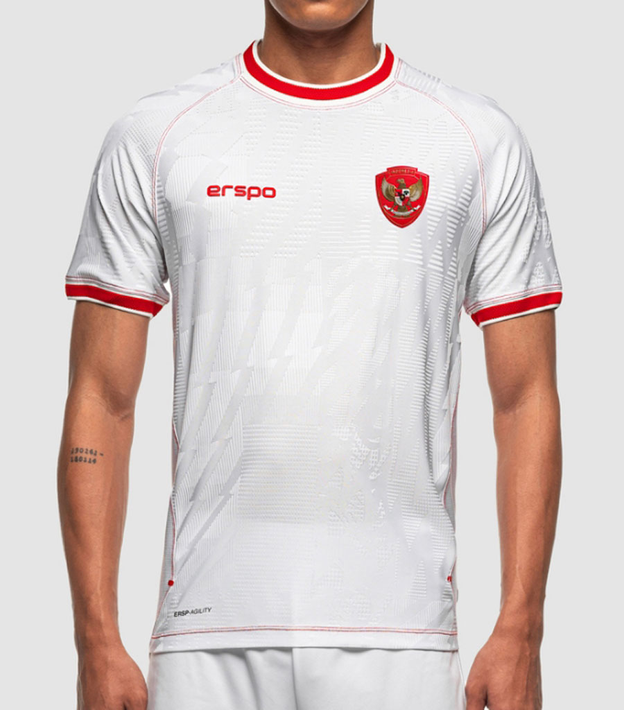 ホームは伝統のレッドを基調に、ホワイトを配したクルーネックと袖口のストライプが目を引く。サプライヤーが変わっても、これまで通りインドネシア国旗カラーをベースとしたデザインだ。