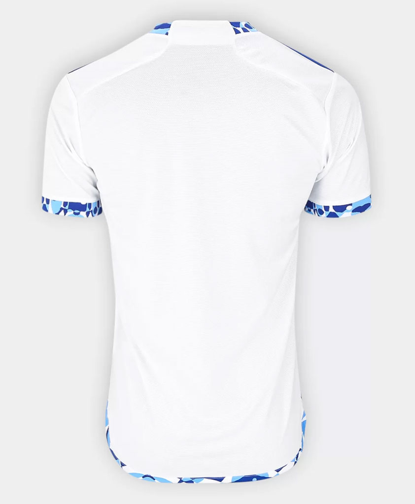 2024新アウェイユニフォームはホワイトを基調に、襟、袖口、脇部分の濃淡ブルーで構成するモザイク状の装飾が非常に印象に残るデザイン。