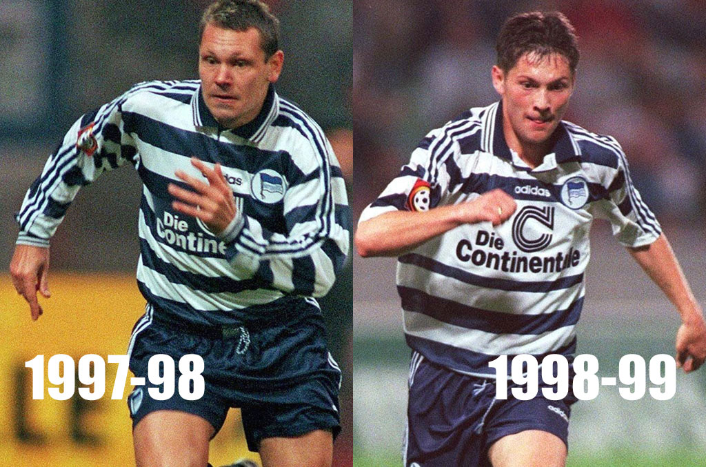 そんなヘルタが4度目の1部昇格となったのが1997-98シーズン。この昇格シーズンは11位とまずまずの成績で終えるが、翌98-99シーズンは3位でフィニッシュと大躍進し、初のUEFAチャンピオンズリーグ出場を決めている。この2シーズンのユニフォームで今回のような“藍色ボーダー”を採用していた。