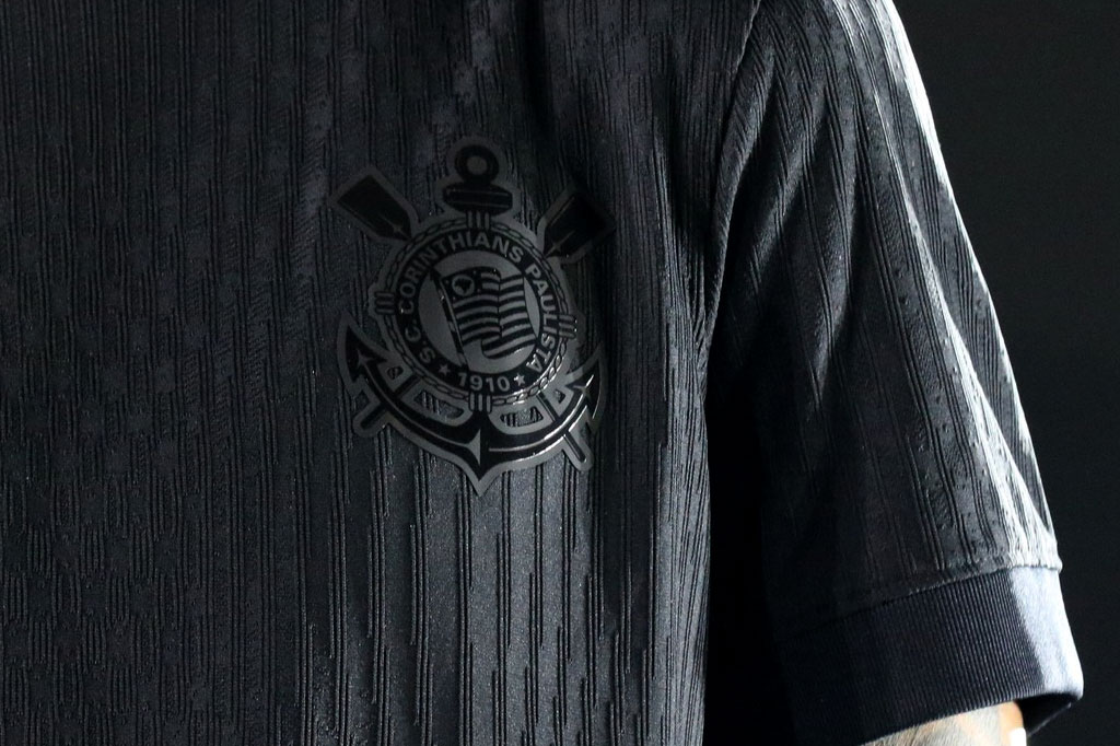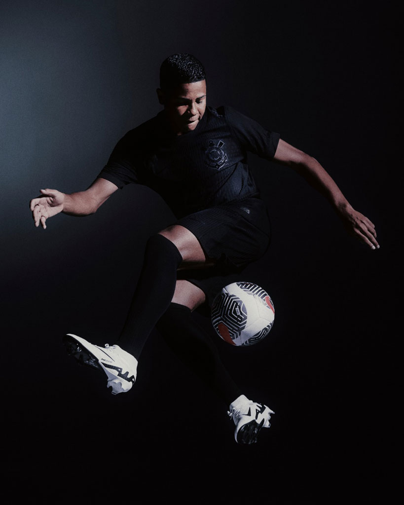 アウェイユニフォームはパンツとソックスにもブラックを採用し、まさに全身真っ黒なスタイルに。こちらもコリンチャンスらしい、メッセージ性に富んだカラーリングだ。