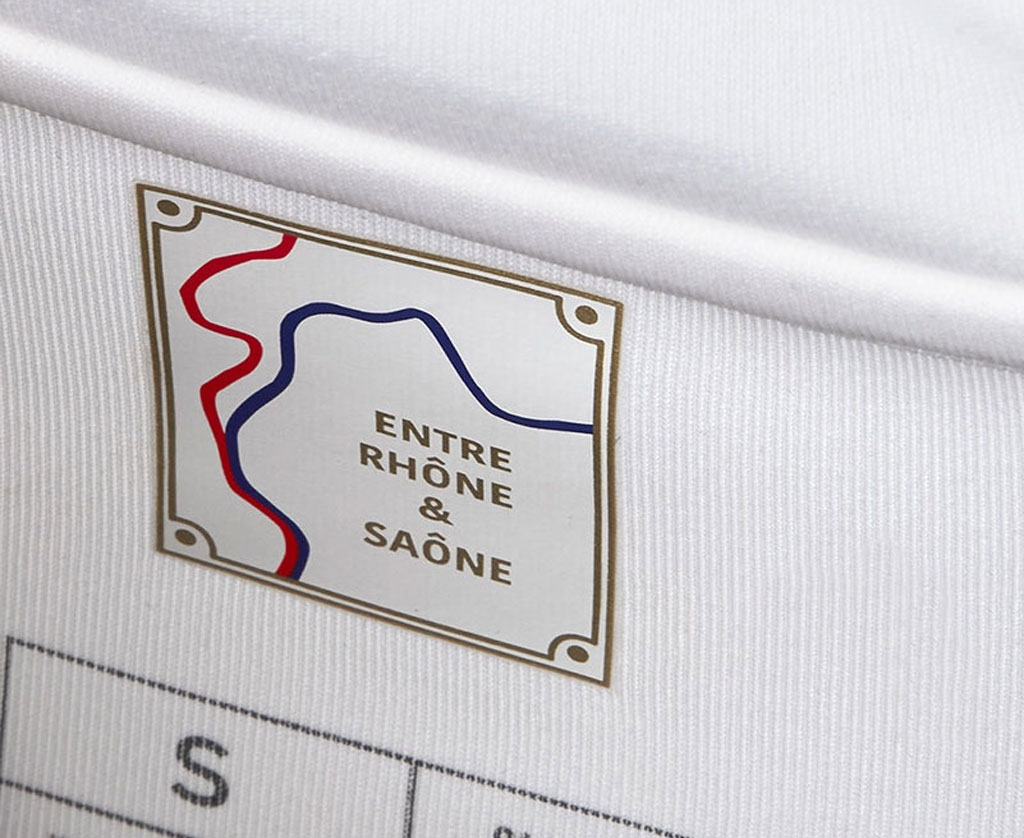 今回のデザインは、ホームタウンのリヨンをはじめフランスを流れる2本の川(ローヌ川、ソーヌ川)にインスピレーションを得たという。首元の内側には、道路標識をイメージしたエレガントなロゴマークで2本の川を描く。