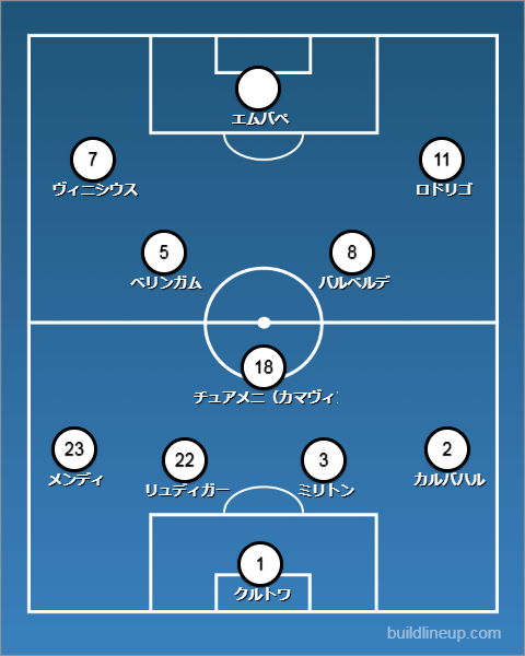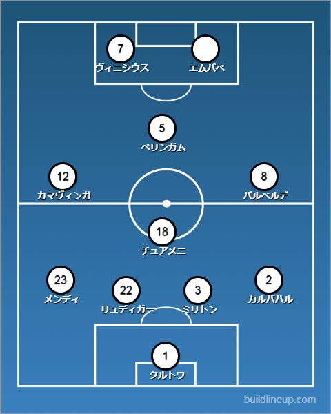 中盤の底にチュアメニを置き、右にバルベルデ、左にカマヴィンガ、トップ下にベリンガム。ロドリゴが外れて、エムバペを入れる形。なお、退団するトニ・クロースに代わって、バルベルデが来季から8番を背負う見込み。