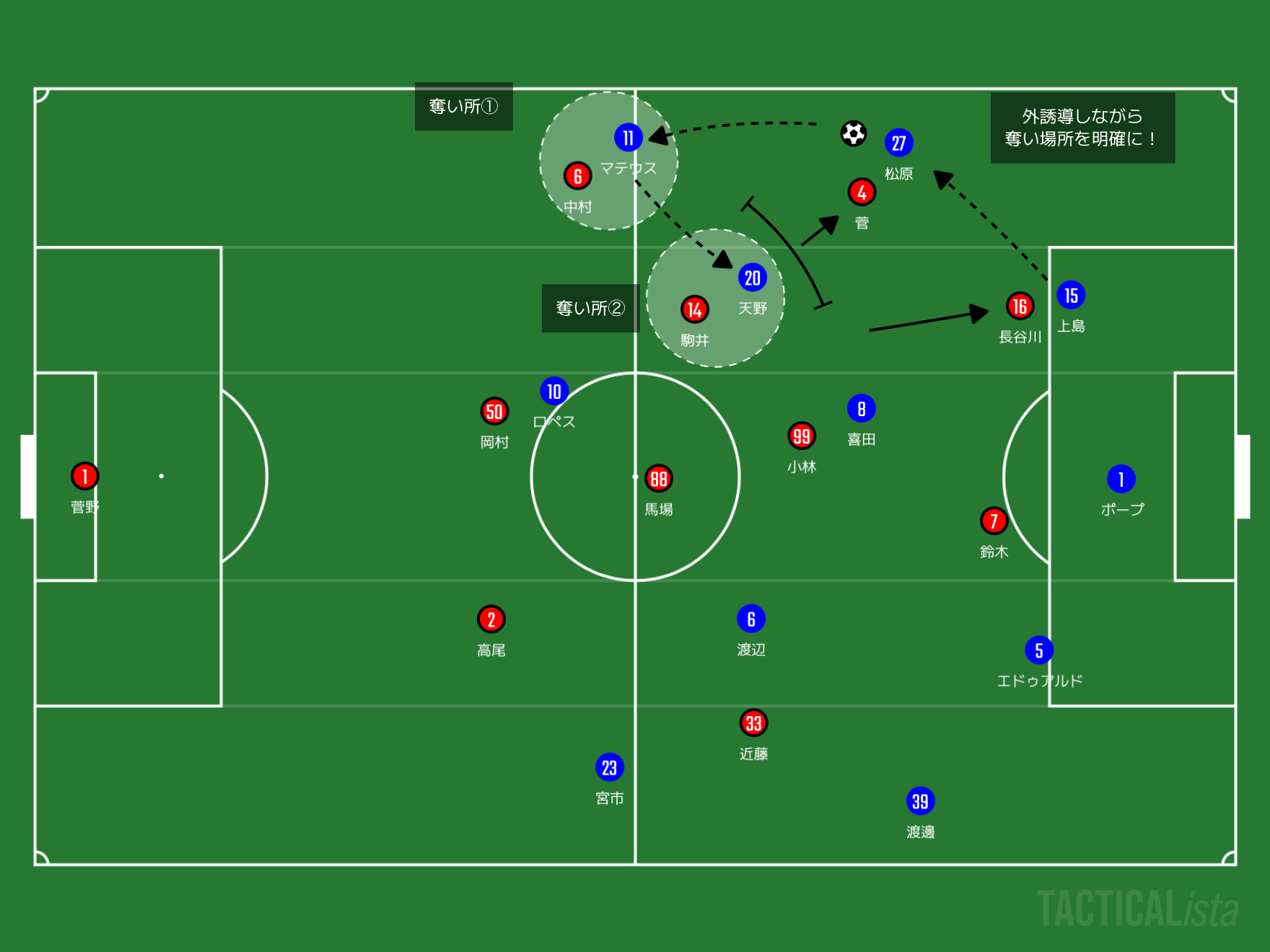 このように小林選手と長谷川選手、鈴木選手が列の入れ替えを行ったことによって、マリノスCBをピン止めしたこと、さらにWBが高い位置をとることによってSBを止めたことにより、喜田選手周辺でボールを引き取れるようになっていました。さらに喜田選手はIHのカバーを常に取り続けるタスクがあるので、視界外から降りてくる小林選手の対応がワンテンポ遅れます。