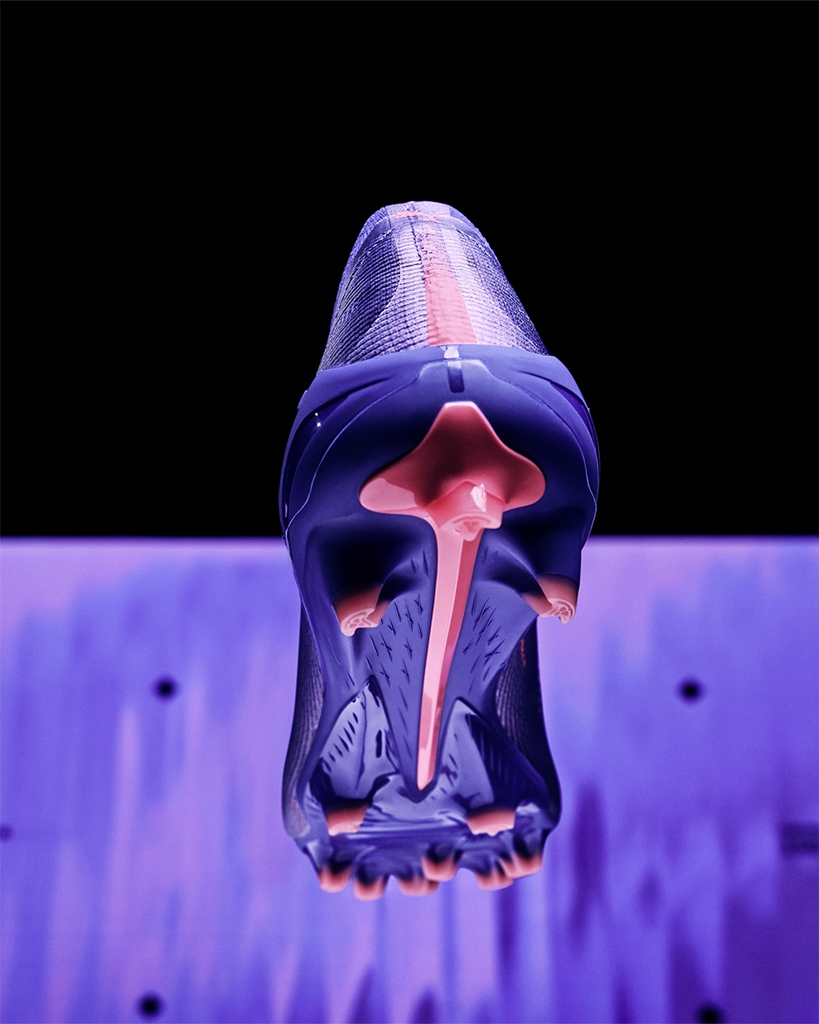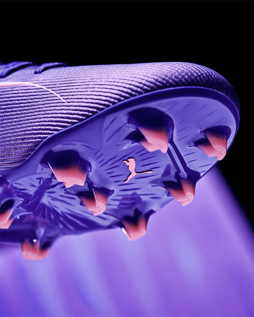 プーマ独自のNEWアウトソール「スピードシステムアウトソール」を開発。軽量な「ペバックス」をベースに、学術的な研究に基づき開発されたT字型の「ファストトラックススタッド」が、加速、ターン、クイックフェイントにおいて最適な蹴り出しを提供し、スピードとトラクションを強化する。