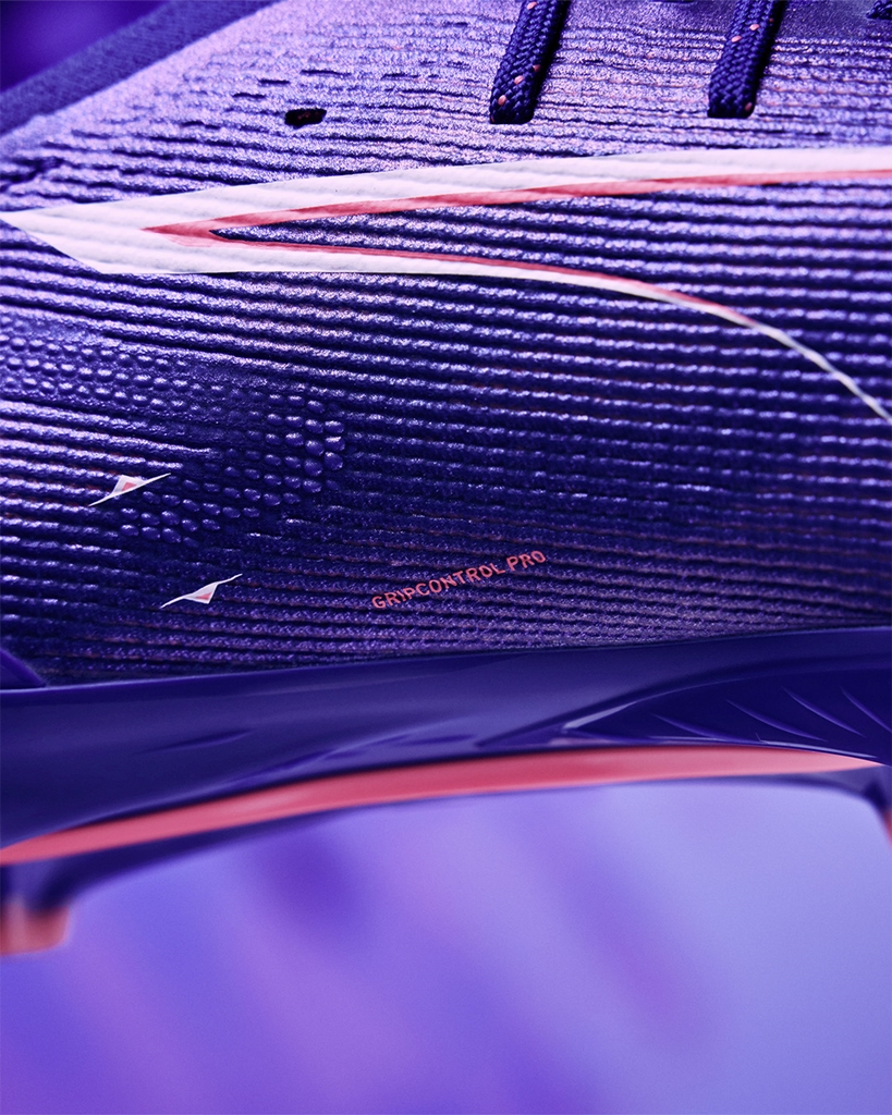 また、極薄のマイクロファイバーで形成される「グリップコントロールプロ」を搭載。グリップアッパー素材が全面を覆うことでボールコントロール性を高めるだけでなくシューズの保形性をサポートする。