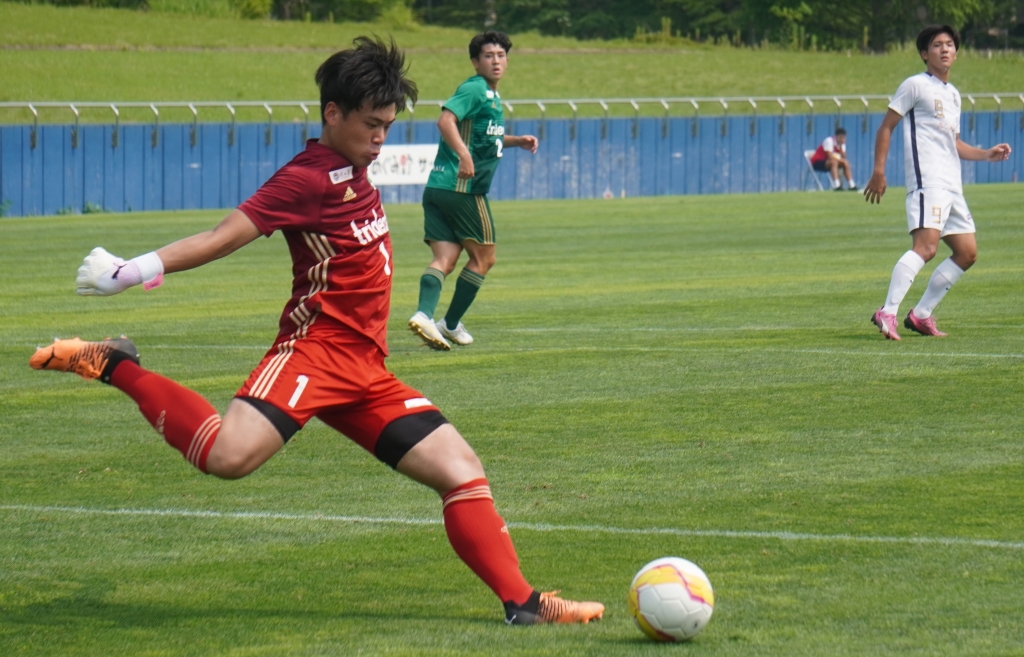 この男に死角はない。この日先発した仙台大GK泉竜聖(4年、仙台大附属明成高)は相手の布陣をずらす精密なビルドアップ、エデルソンを彷彿させる高精度フィード、正確なコーチング、ピンチを防ぐハイボール処理とセービングなど優れた総合力で仙台大ゴールに堅い鍵をかけた。