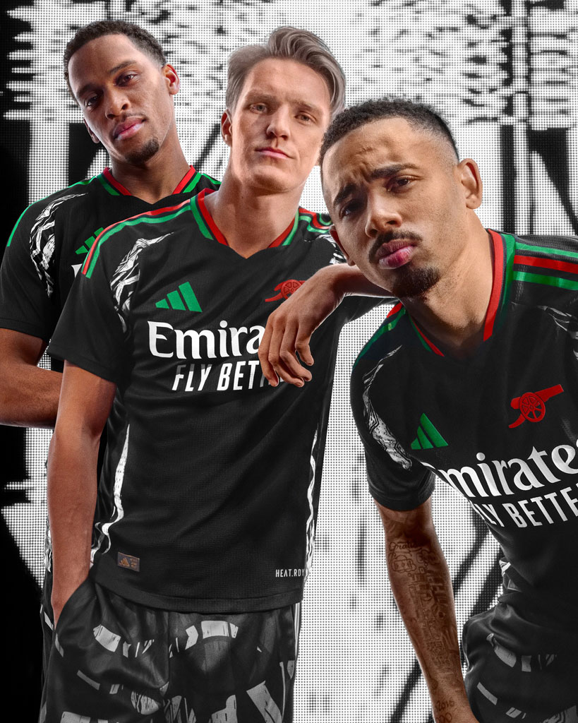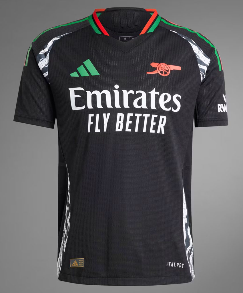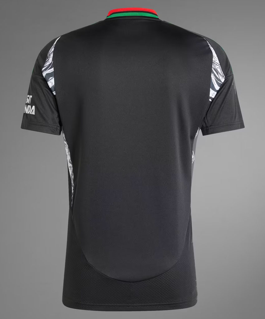 2024-25新アウェイユニフォームは、ブラックを基調にレッドとグリーンの鮮やかなデザイン。脇部分のホワイトとブラックのグラフィックも特徴的だ。