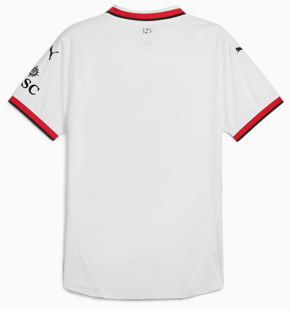 2024-25新アウェイユニフォームは、ホワイトを基調にチームカラーのロッソネロ(赤と黒)のストライプを各部に配したデザイン。シンプルだが実に優雅な一着に仕上がっている。