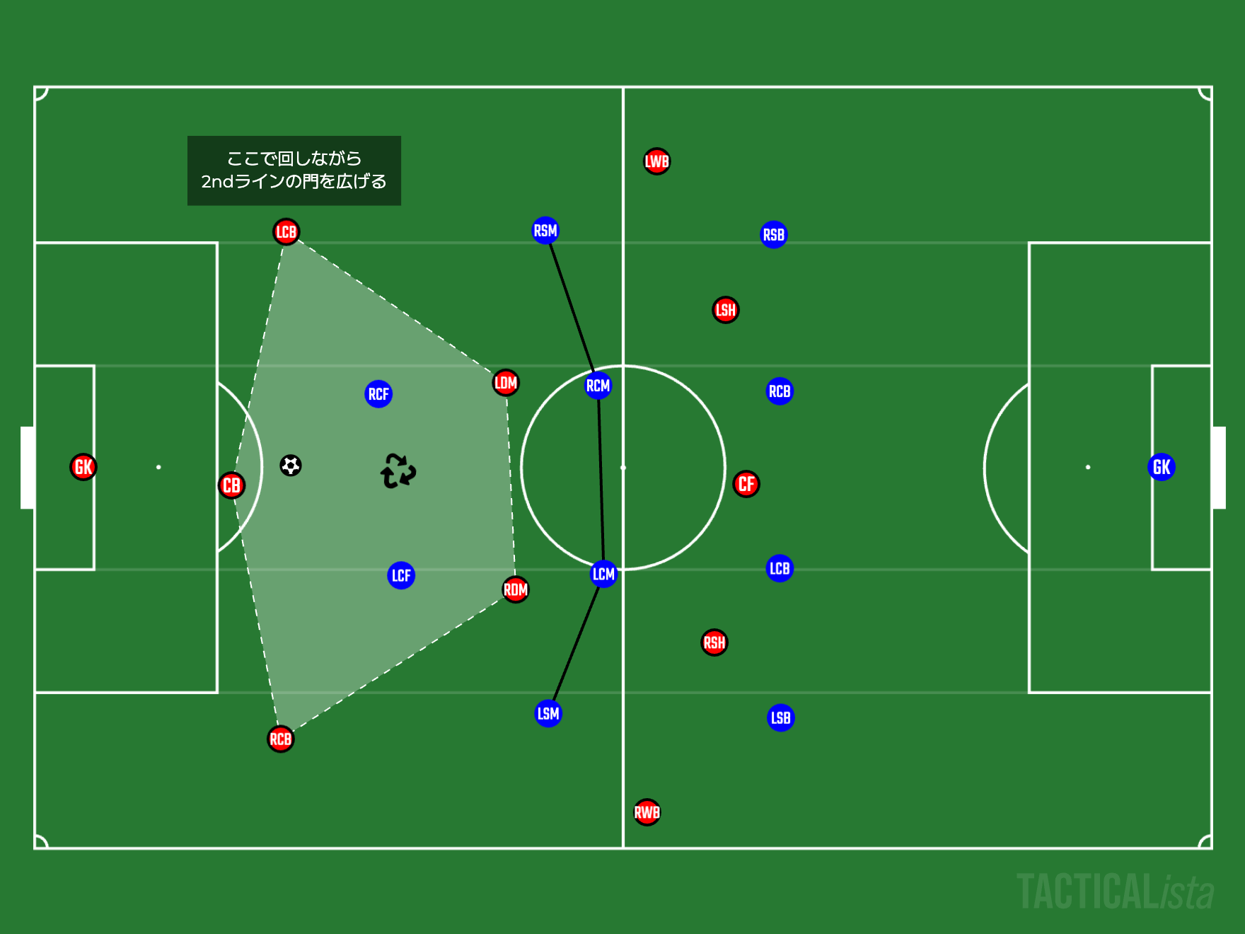 主にこの2つの影響力を取れるようになったので、前進が安定していきます。受けやすい場所、対戦相手の1stプレスラインの手前に降りて、ビルドアップに割く人数が過剰になる事がなくなりました。