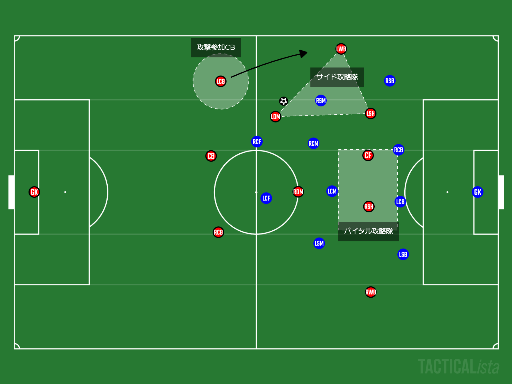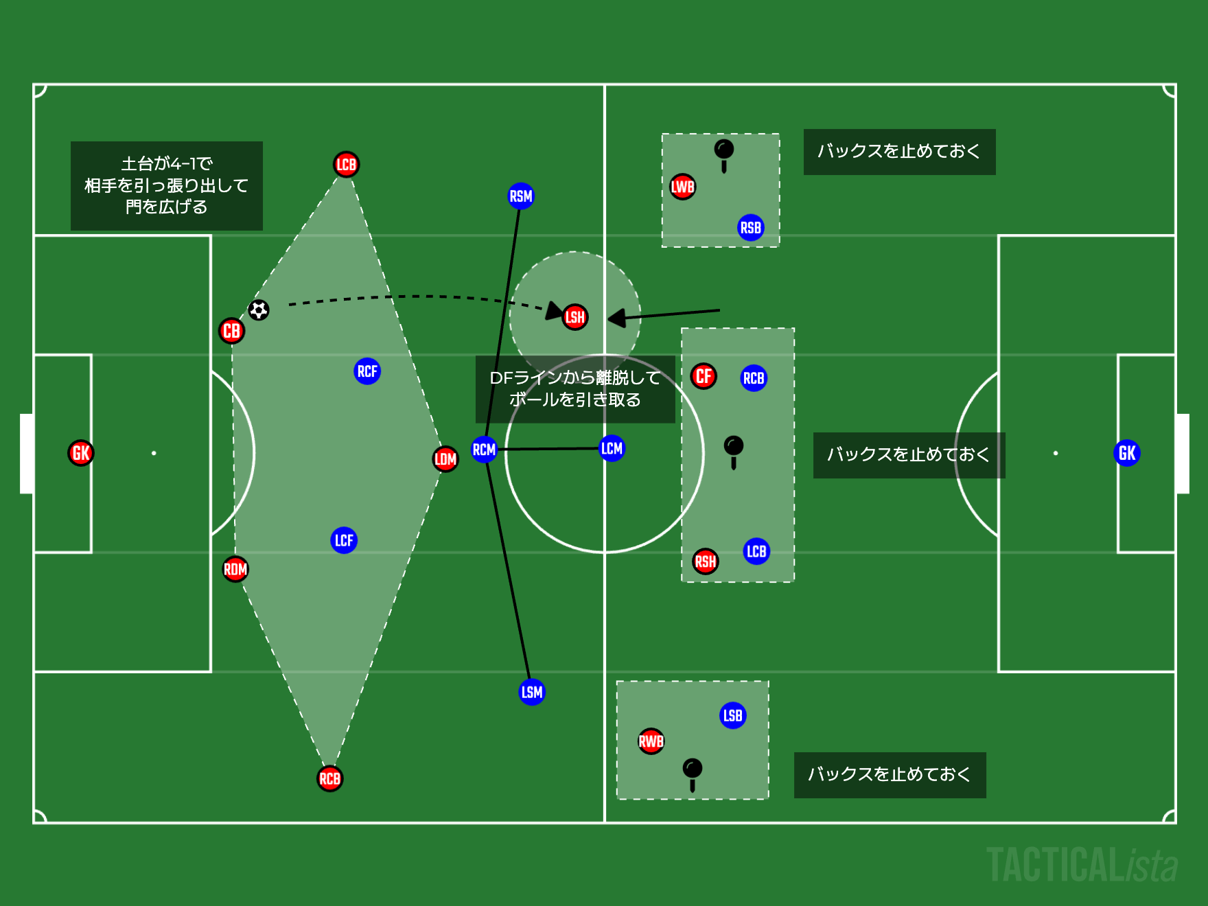 大崎選手の加入によって3−2の土台と4−1の土台の行き来がスムーズになりました。この行き来は矢印を自分たちに向けるのではなく、きちんと対戦相手ありきで考えられています。だからこそ3−2と4−1の使い分けができ、影響を与える事が出来る土台を選択できるようになりました。
