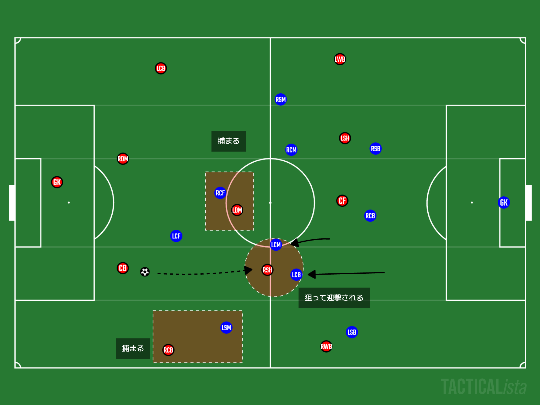 この3つが綺麗につながってしまい、ネガティブ・トランジションに入ることができなくなっていました。ネガティブ・トランジションが機能しないので、多くの時間帯で攻撃が頓挫してカウンターを受け続けることが多くなっていました。