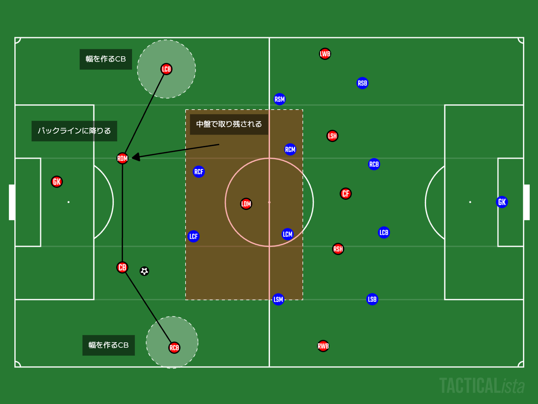 まず1つ目に『相手に影響を与えられていない状況下での可変』です。ビルドアップにソースを割き過ぎていたので、中盤の人数が足りない状況になることが多々ありました。