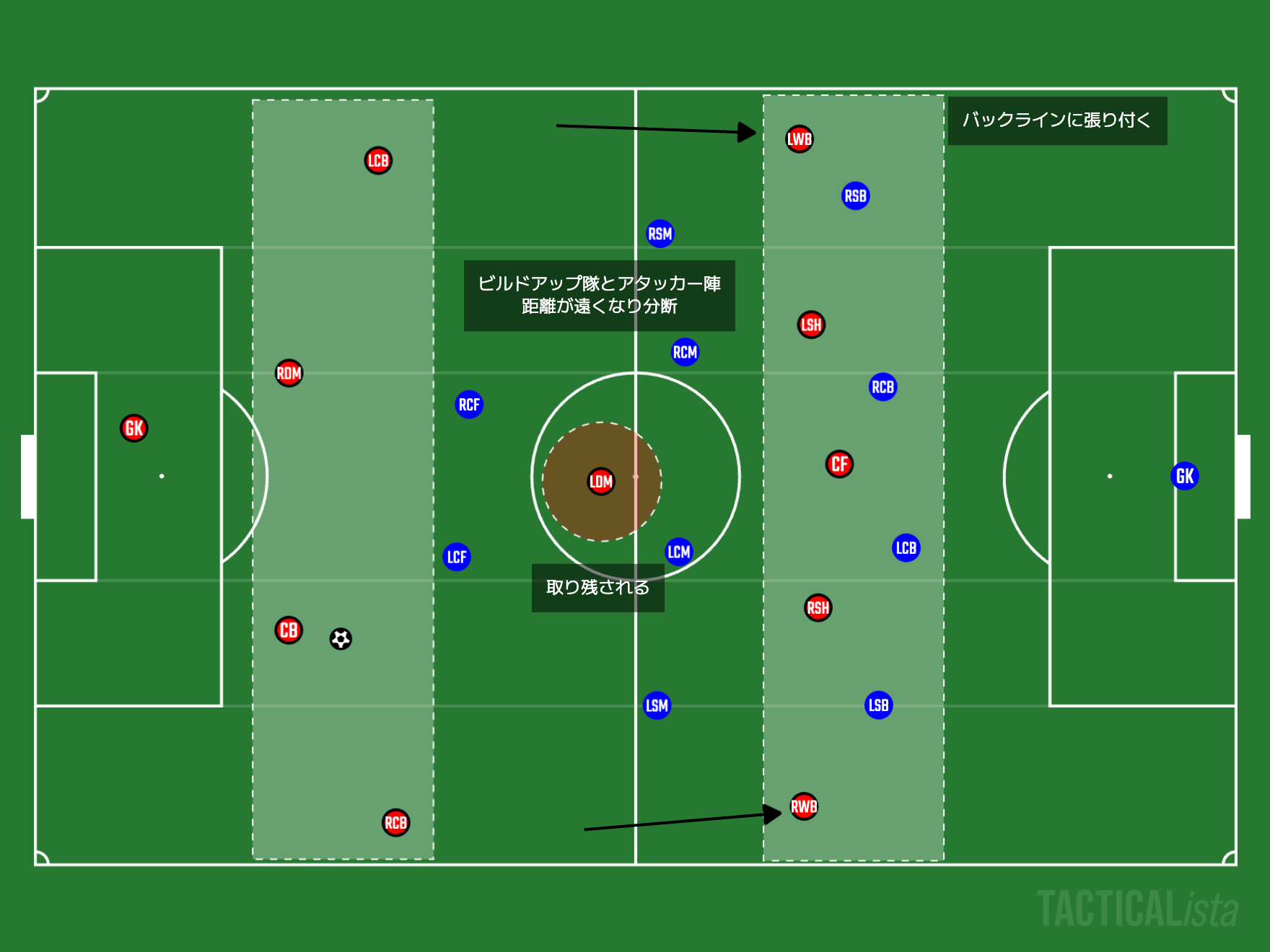 そして3つ目が空洞化と分断による『サポートの少なさと迎撃』です。前後分断による空洞化により、対戦相手の最終ラインに張り付く5枚がボールを引き取るために列を落とすことが多くなっていきます。